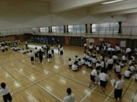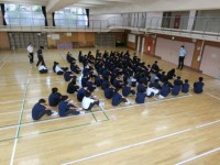 23日は学年朝会です。1年生は格技室、2年生は体育館で行いました。