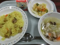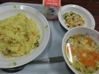 メニューは牛乳、メキシカンピラフ、ポテト入りフレンチサラダ、いなか風豆スープです...