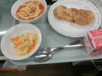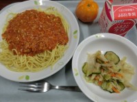 メニューは牛乳、大豆入りスパゲッティミートソース、ツナサラダ、冷凍ミカンです。蒸...