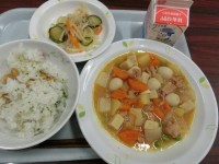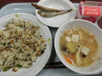 メニューは牛乳、大豆入りひじきご飯、焼きシシャモ、さつま汁です。さつま汁にはサツ...