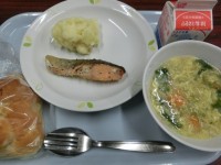 メニューは牛乳、パインパン、鮭のハーブ焼き、クリームポテト、卵と青菜のスープです...