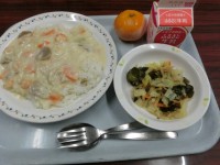 メニューは牛乳、冷凍ミカン、わかめサラダ、ごはんのクリームソースがけです。暑い日...