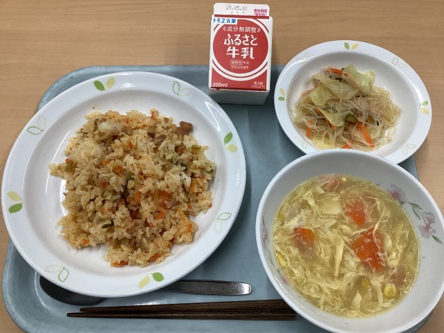 今日の献立は、チキンライス、ベーコンと野菜のスープ、ポテト入りフレンチサラダ、牛...