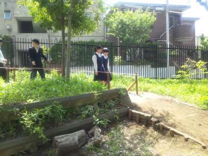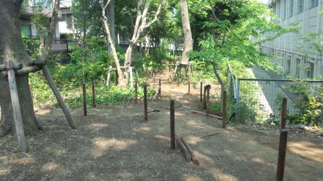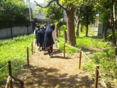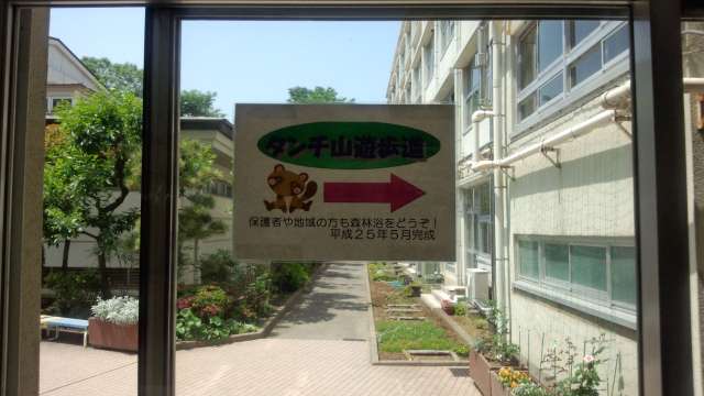 武蔵野の自然が残る駒沢中のシンボル「タンチ山」、生徒や地域の方々が自然に親しみ、日常から自然とかかわれるように、遊歩道を整備しています。ESD(持続発展教育)のフィールドワークにも活用します。