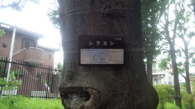 右の写真の解説「うっそうとした緑道の中にあって、ひときわ目をひく二本の大樹」(駒沢中学校付近)