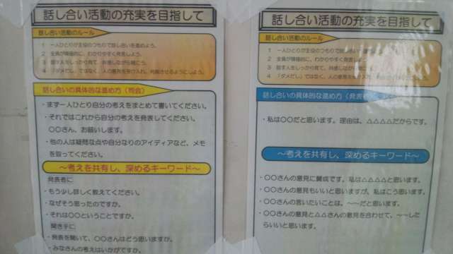 駒沢中学校では、話し合い活動をより深めるため、「話し合い活動の進め方」を各教室に掲示し、「話し合い活動カード」(6班分)を準備して取り組んでいます。