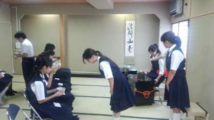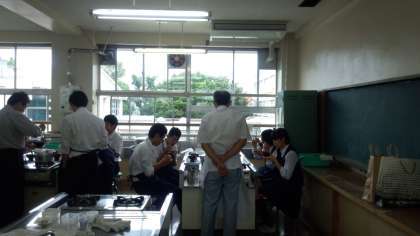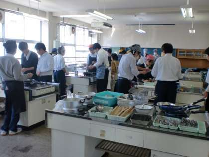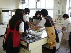 家庭科の授業の調理実習、家庭科部の調理体験、茶道部のお茶会の様子です。