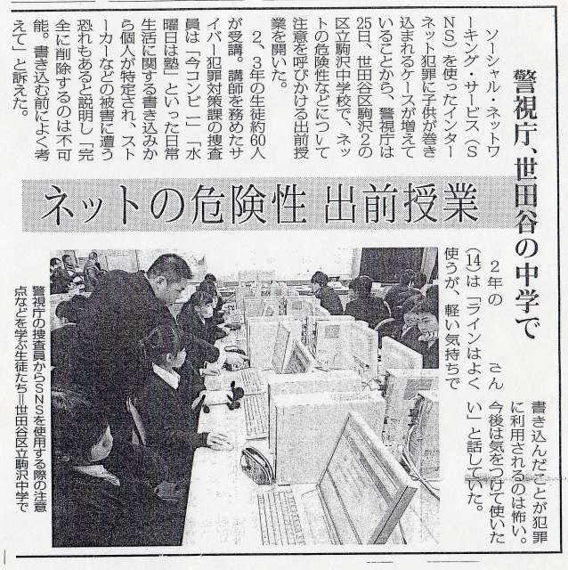 警視庁サイバー犯罪対策課と東京都が連携し、青少年がインターネット上のルールやマナーなど情報コミュニケーション技術を正しく学ぶことにより、サイバー犯罪から青少年を守り、サイバー犯罪の防止と青少年の健全育成を目指して、第14回サイバー犯罪対策シンポジウムを駒沢中学校で実施しました。