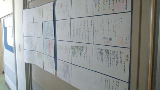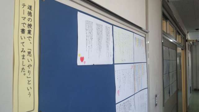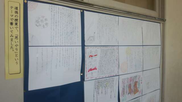 道徳の時間に「思いやり」についての考えや体験などを一人ひとりが書いたものを掲示しています。身近な思いやり、地球規模の思いやり、思いやりを受けた体験などを、文章や詩で表現しています。(2年生)