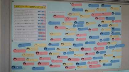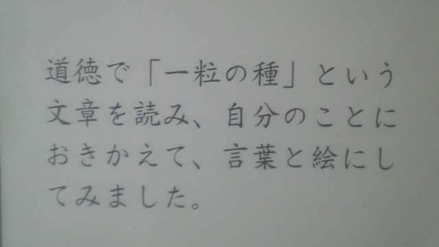 2年生の廊下の掲示物です。道徳の時間に「一粒の種」という資料を使って授業を行いましたが、その時の考えや思いを自分のことに置き換えて、ことばと絵で表現した掲示です。みんなとてもよく考えていて、すばらしいと思いました。