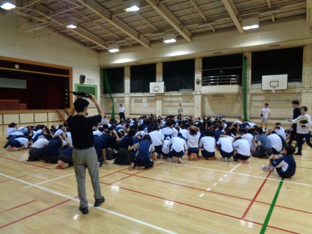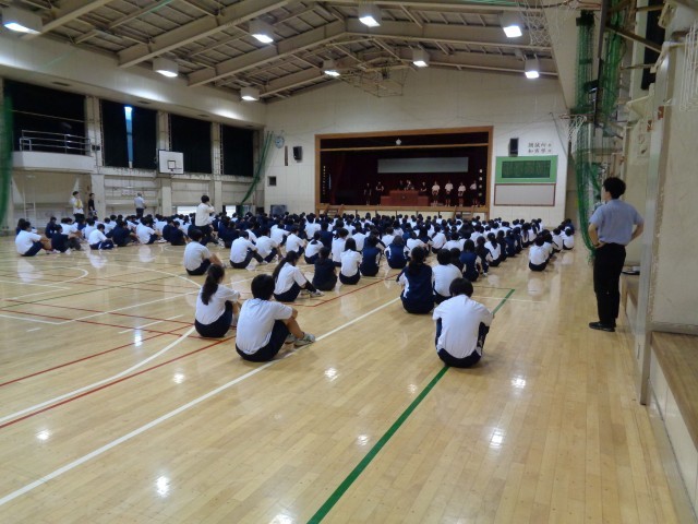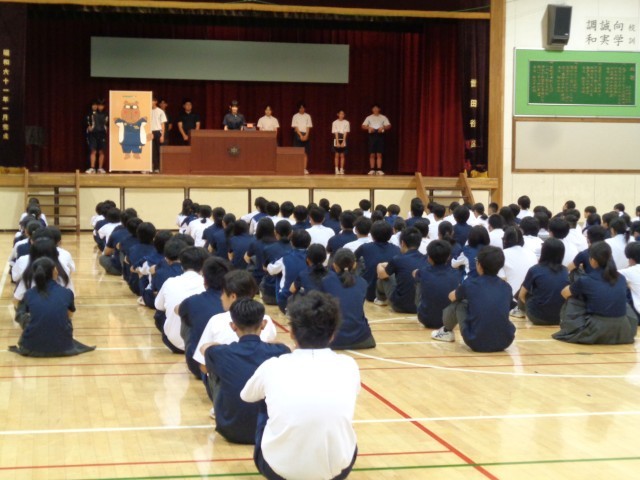 1学期最後の生徒会朝礼でした。各委員会委員長からの報告と生徒会長の話がありました。保健委員会からは新しくなった「くまざわ君」を紹介しました。くまざわ君の身長は122cmです。生徒会長からは夏休みを有意義に過ごしてください、という話がありました。朝会後、訓練のための緊急地震速報が鳴り、体育館の真ん中に集まり、頭を守る訓練をしました。自分の命は自分で守りましょう。