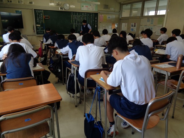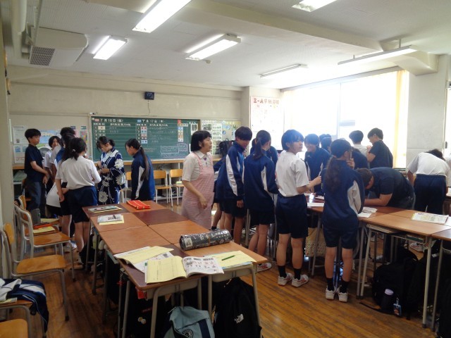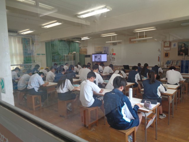 4校時の1年生の授業は英語、国語、地震はどのように伝わるか(理科)です。2年生は、手縫いの基礎技能(家庭科・写真付き)、社会、背泳ぎ(水泳・写真付き)です。3年生は、「自分の手を描き出している自分の手」を写実的に描く(美術・写真付き)、数学、報道文を比較して読もう(国語・写真付き)です。