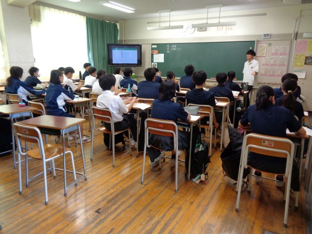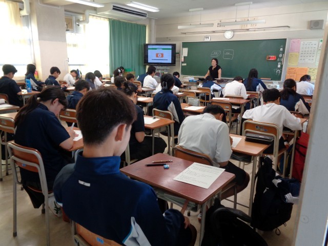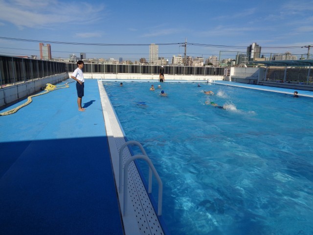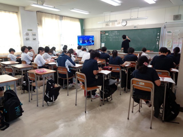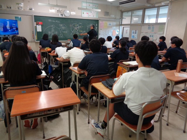 6校時の1年生の授業は音楽、英語(写真付き)です。2年生は、一次関数とグラフ(数学・写真付き)、理科です。3年生は、水泳(写真付き)、詩の中の抽象と具体の関係を捉える(国語)、理科(写真付き)です。