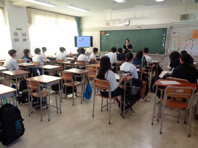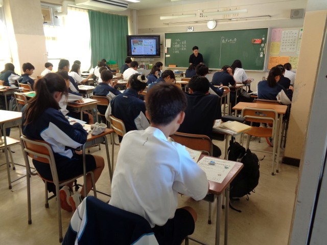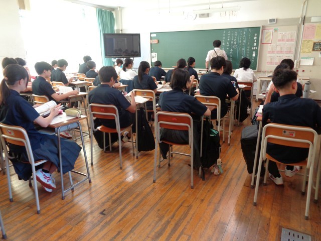 1校時の1年生の授業は、色彩構成(美術)、水泳、中国文明がどのように発展し、どのような特色があったのか理解する(社会・写真付き)です。2年生は、本文を通読し、作品の「面白さ」について考えよう(国語・写真付き)、英語(写真付き)です。3年生は、学習習得状況調査(国語)です。