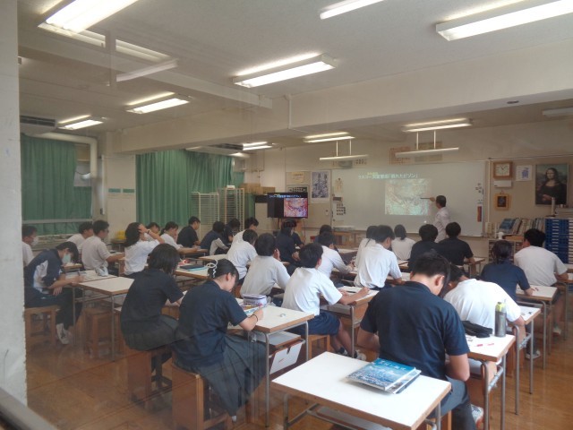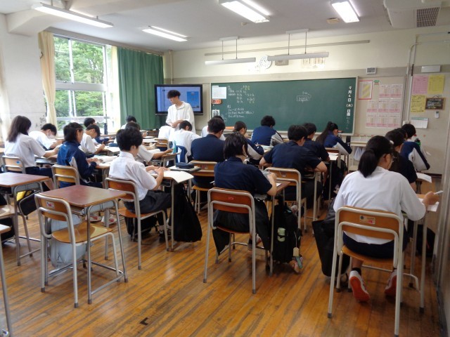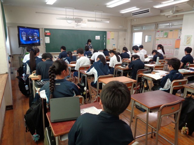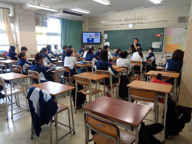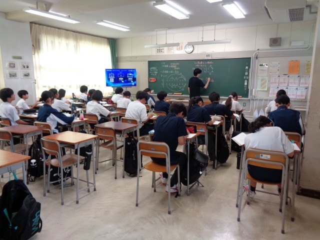 3校時の1年生の授業は、食事と健康(保健)、英語(写真付き)です。2年生は、一次関数(数学・写真付き)、家庭科(写真付き)です。3年生は水泳(写真付き)、生命の連続性(理科)、美術(写真付き)です。