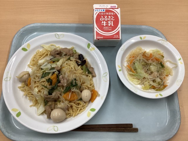 今日の献立は、五目あんかけ焼きそば、春雨サラダ、牛乳です。