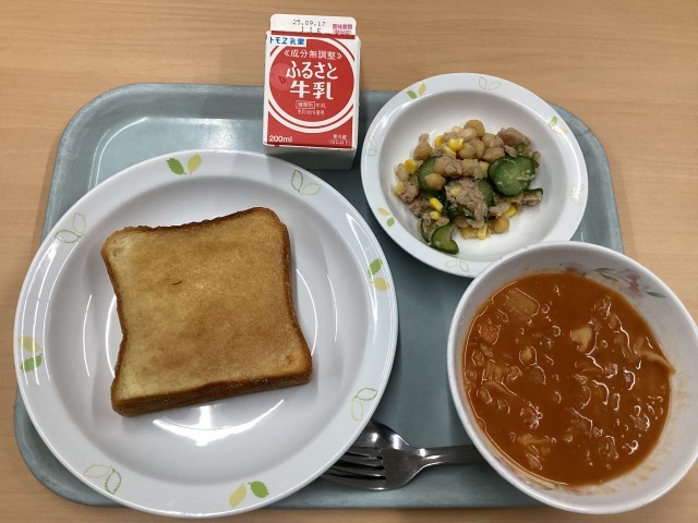今日の献立は、シナモントースト、ボルシチ、ビーンズサラダ、牛乳です。