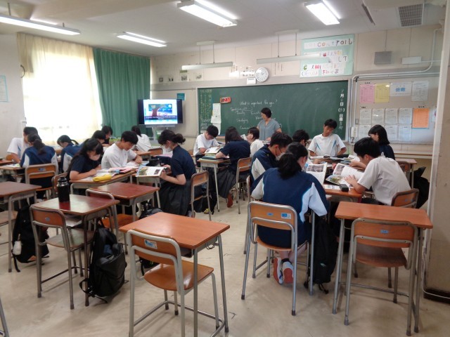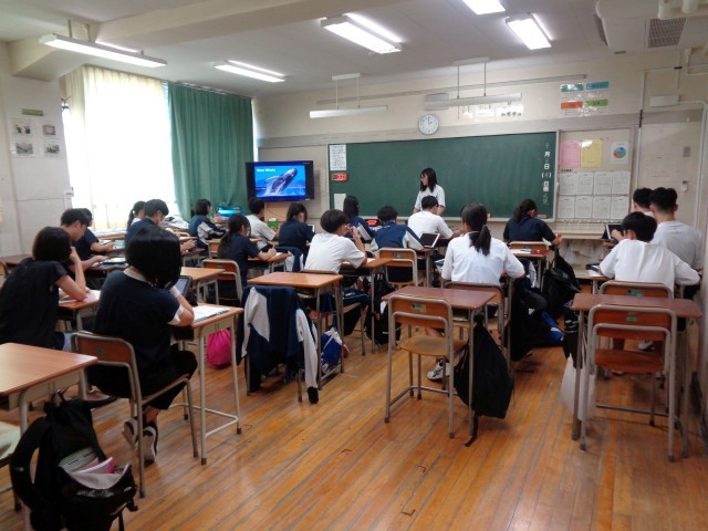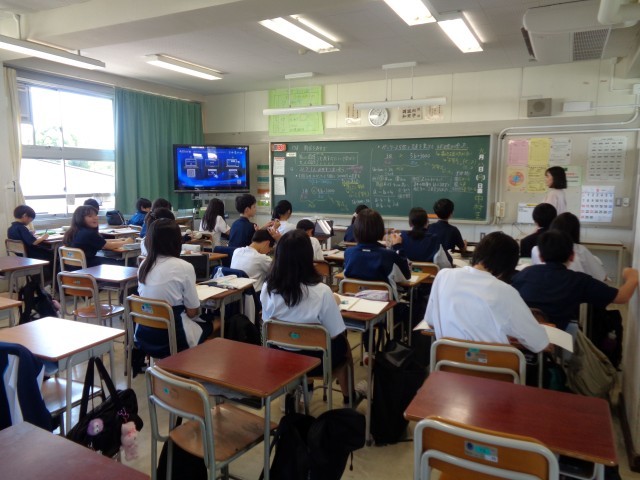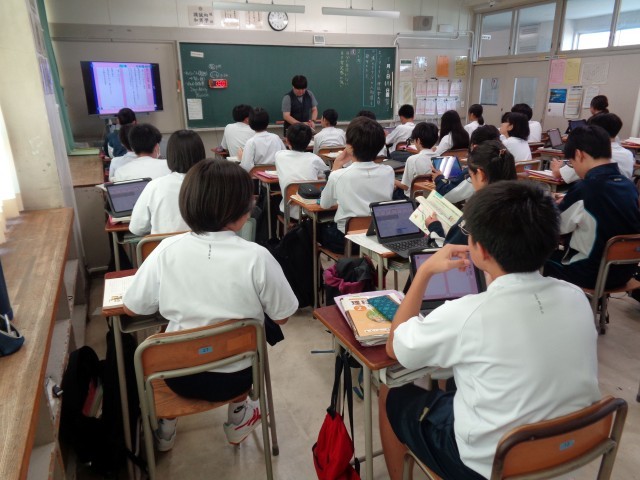 5校時の1年生の授業は、古代ギリシャとローマ帝国について理解する(社会)、関係を表す式(数学・写真付き)、場面ごとの心情の変化を捉えよう(国語)です。2年生は社会、水泳、「僕」と「タクジ」の人物像を読みとろう(国語・写真付き)です。3年生は、情報化とは(社会)、英語(写真付き)です。