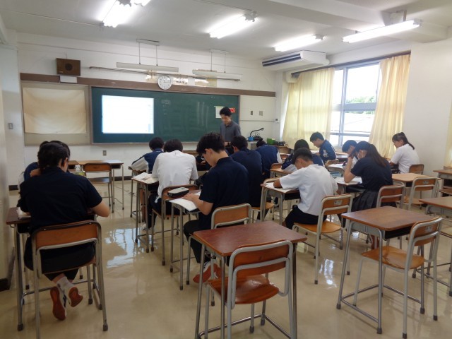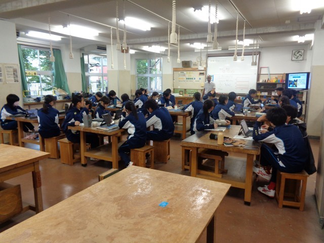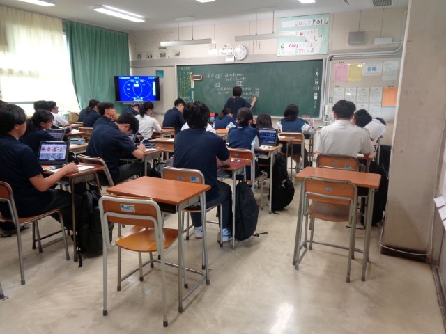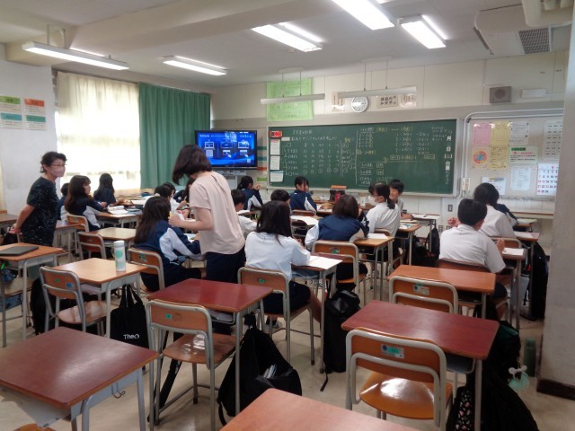 3校時の1年生の授業は、主人公の心情がわかる情景描写を考える(国語)、文字式の利用(数学・写真付き)、倭人(社会)です。2年生は、生物育成の技術が果たしてきた役割(技術・写真付き)、水泳(写真付き)、国語です。水泳では足にフィンを装着して泳ぎました。スピードの変化を感じましたか。3年生は英語(写真付き)、タブレットの設定、植物と動物の細胞分裂の比較(理科)です。