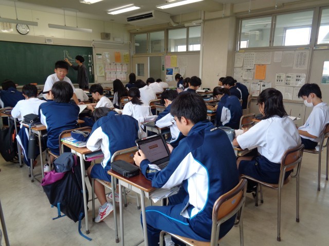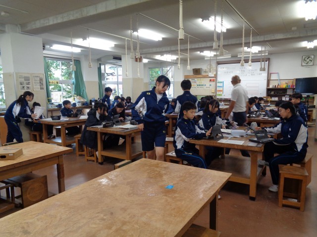 6校時の1年生の授業は英語、Tボール(保健体育・写真付き)、3D CADで計算する(技術・写真付き)です。2年生は数学、国語です。3年生は理科、社会、合唱(音楽)です。