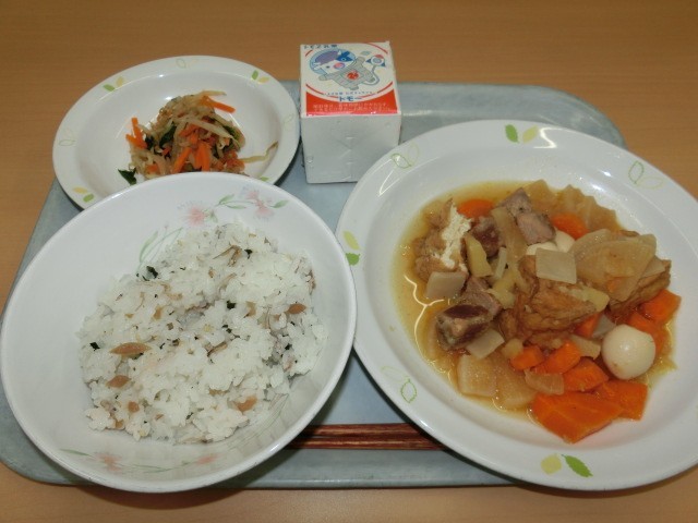 今日の献立は、梅とわかめごはん、豚肉と大根のうま煮、野菜のおかか和え、牛乳です。