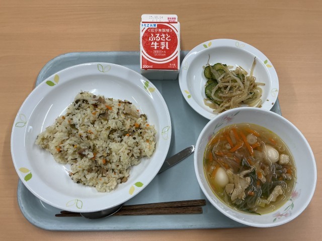 今日の献立は、高菜のチャーハン、春雨スープ、きゅうりともやしの中華和え、牛乳です。本日の春雨スープは、本校のリクエスト給食のアンケート結果から取り入れられたメニューです。