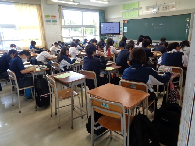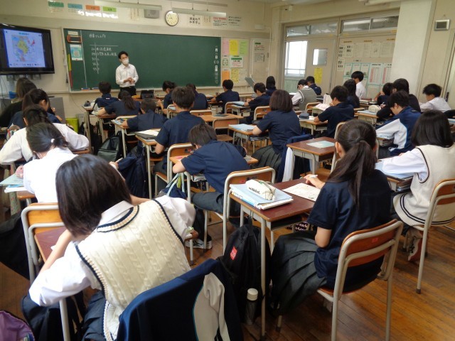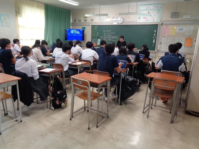 1校時の1年生の授業は、平安時代の東アジアの変化と文化の特色を理解する(社会・写真付き)、英語(写真付き)です。