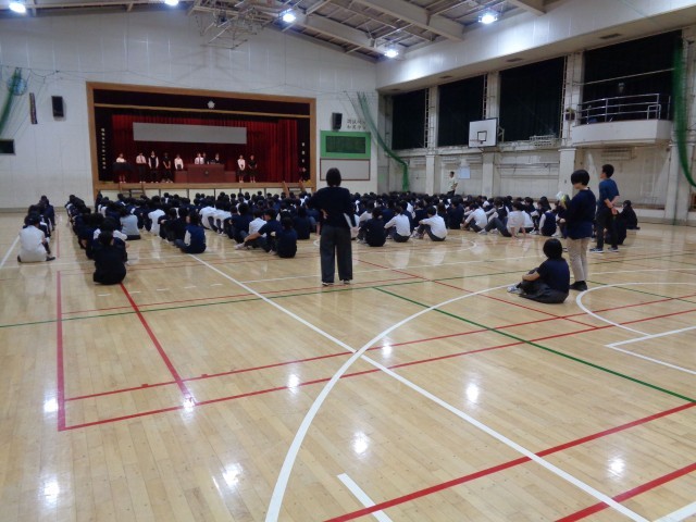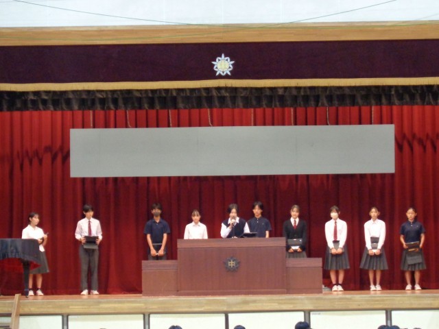 後期になって最初の生徒会朝礼です。新生徒会役員が司会進行し、各委員会委員長になった2年生が全校生徒の前で後期の活動内容などを話しました。生徒会長からは、学校生活におけるルールの確認と週末に開催される合唱コンクールについて話をしました。生徒会役員と各委員会委員長の皆さんの発表する態度は堂々としていて立派でした。