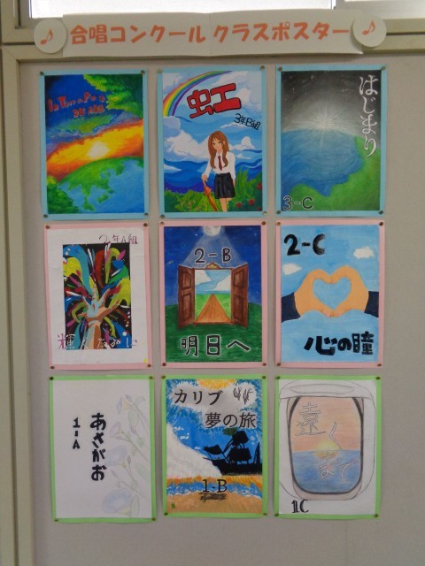 明日が合唱コンクール当日です。校舎2階の職員室前の廊下に各クラスのポスターが掲示してあります。ポスターを描いた生徒の皆さんありがとう。今日の午後に準備を行います。