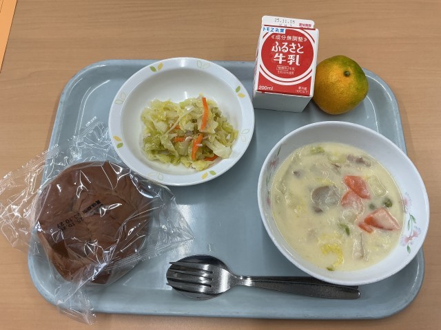 今日の献立は、ココアパン、白菜のクリームシチュー、コールスロー、みかん、牛乳です。