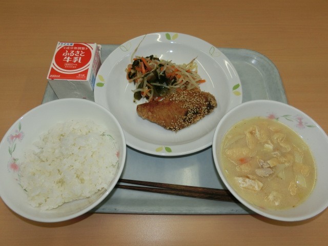 今日の献立は、ごはん、かつおのあずま煮、もやしとわかめのごま酢和え、飛鳥汁、牛乳です。