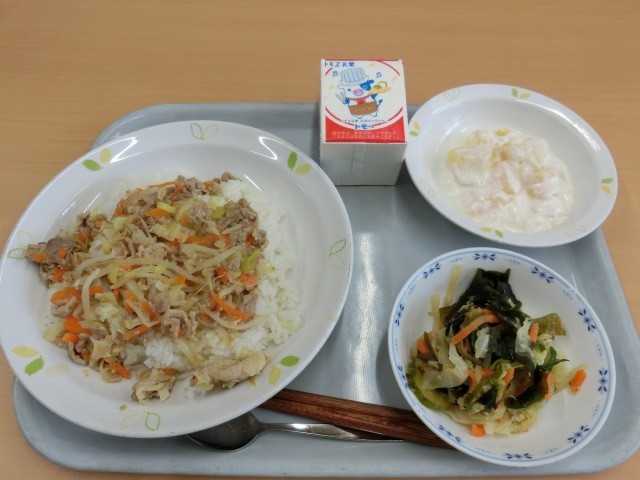今日の献立は、ねぎ塩豚丼、わかめサラダ、フルーツのヨーグルトがけ、牛乳です。