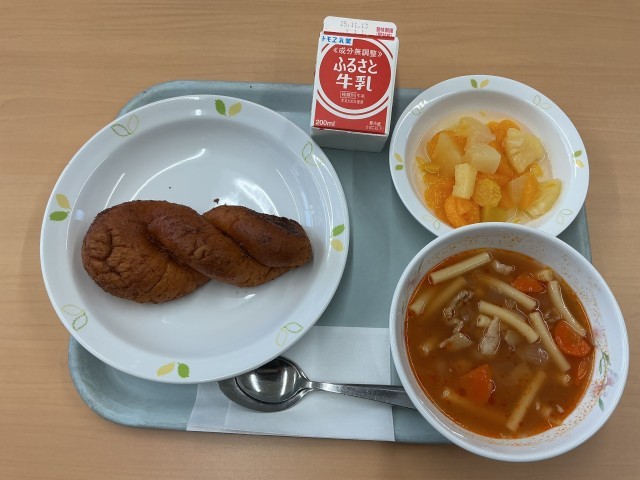今日の献立は、ココア揚げパン、ひよこ豆入りミネストローネ、フルーツポンチ、牛乳です。なお、明日の給食の提供はありませんのでご注意ください。