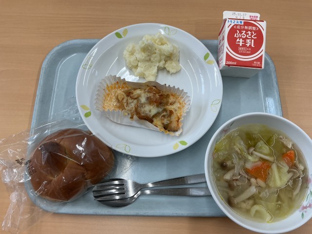 今日の献立は、黒砂糖パン、魚のピザ焼き、クリームポテト、いなか風豆スープ、牛乳です。