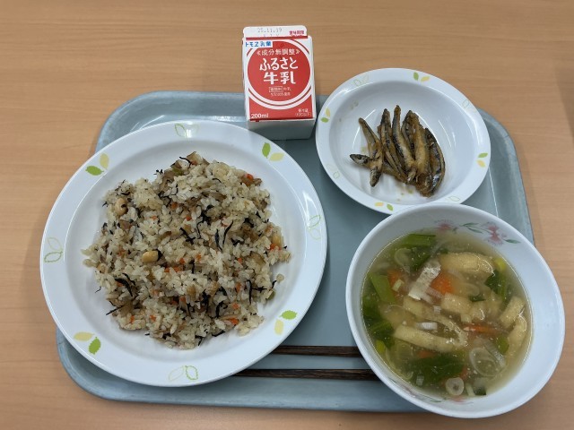 今日の献立は、大豆入りひじきごはん、小魚の甘辛揚げ、豆腐汁、牛乳です。