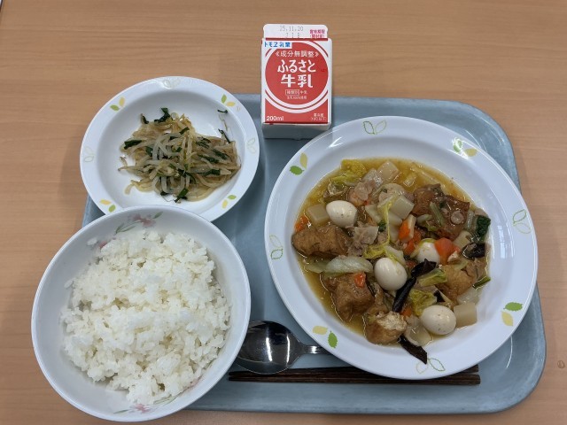 今日の献立は、ごはん(有機米)、生揚げの中華煮、もやしとにらのごま風味、牛乳です。