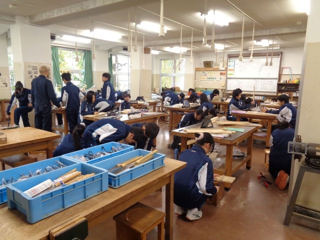 2校時の1年生の授業は、古典特有のリズムを意識して音読し、古典を親しもう(国語)、理科、けがき線に沿って切断する(技術・写真付き)です。