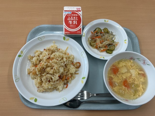 今日の献立は、中華五目ごはん、大根とじゃこのカリカリサラダ、かきたま汁、牛乳です。