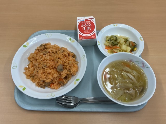 今日の献立は、チキンライス、ベーコンと野菜のスープ、ポテト入りフレンチサラダ、牛乳です。