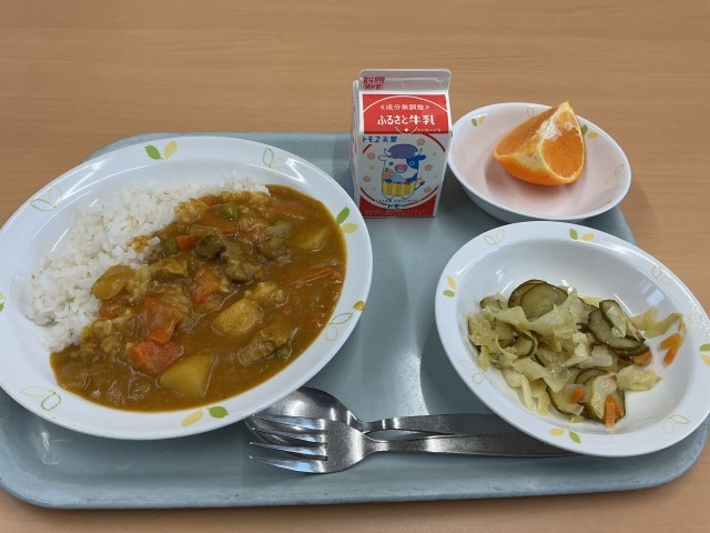 今日の献立は、カレーラース、ハーブサラダ、くだもの、牛乳です。