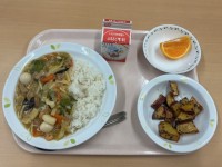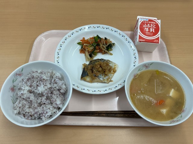 今日の献立は、ゆかりごはん、魚の香味焼き、野菜のごま和え、豚汁、牛乳です。