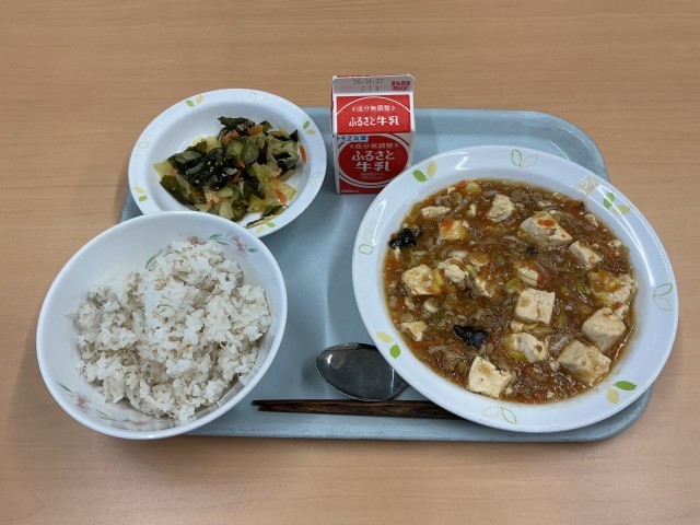 今日の献立は、じゃこごはん、麻婆豆腐、わかめサラダ、牛乳です。