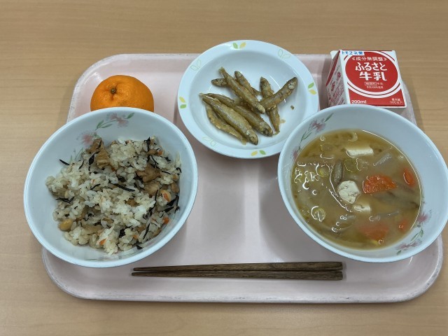 今日の献立は、大豆入りひじきごはん、小魚のから揚げ、いなか汁、くだもの、牛乳です。