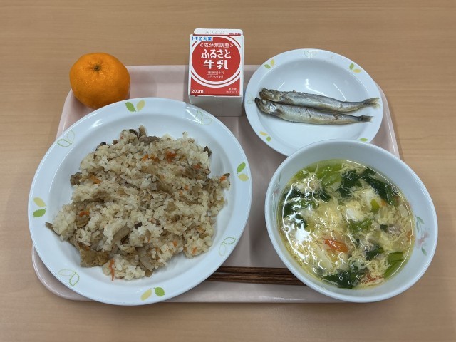 今日の献立は、豚肉とごぼうの混ぜごはん、焼きししゃも、かきたま汁、くだもの、牛乳です。