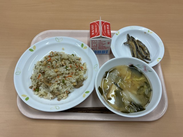 今日の献立は、豚肉と昆布のごはん、小魚の甘辛揚げ、みそ汁、牛乳です。