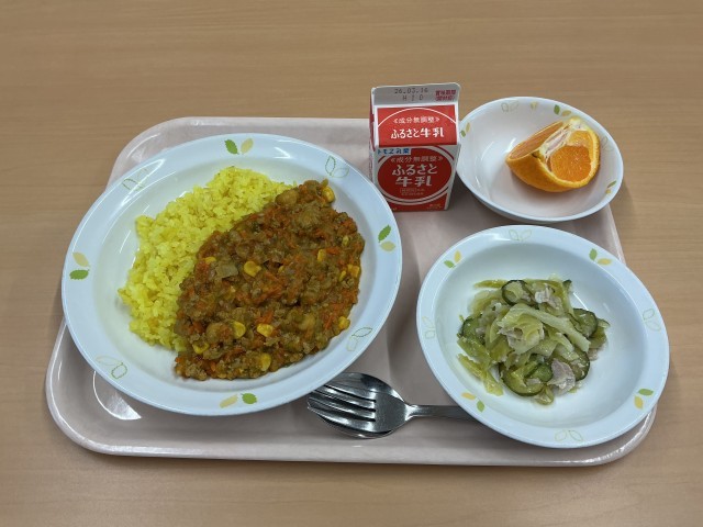 今日の献立は、ひよこ豆のカレー、ハムサラダ、くだもの、牛乳です。