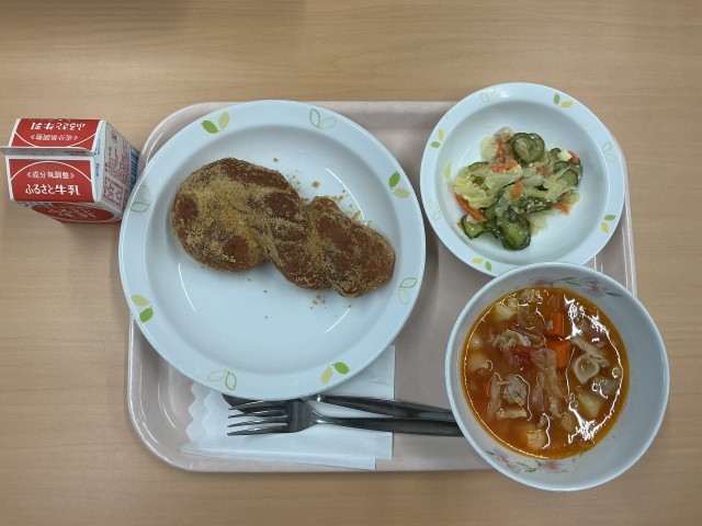 今日の献立は、きな粉揚げパン・ミネストローネ・チーズサラダ・牛乳です。