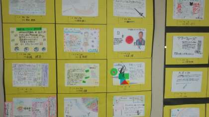 写真右は、1年生の廊下の掲示物です。本の紹介がわかりやすく、おもしろいです。やっぱり掲示物があると、廊下が明るくなりますね。