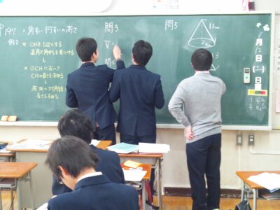 三平方の定理の空間図形の問題の解法を生徒たちが黒板に書いて発表しているところです。