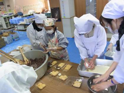 つきたてのお餅はすぐに丸められ、きなことあんこ味にパック詰めをしました。